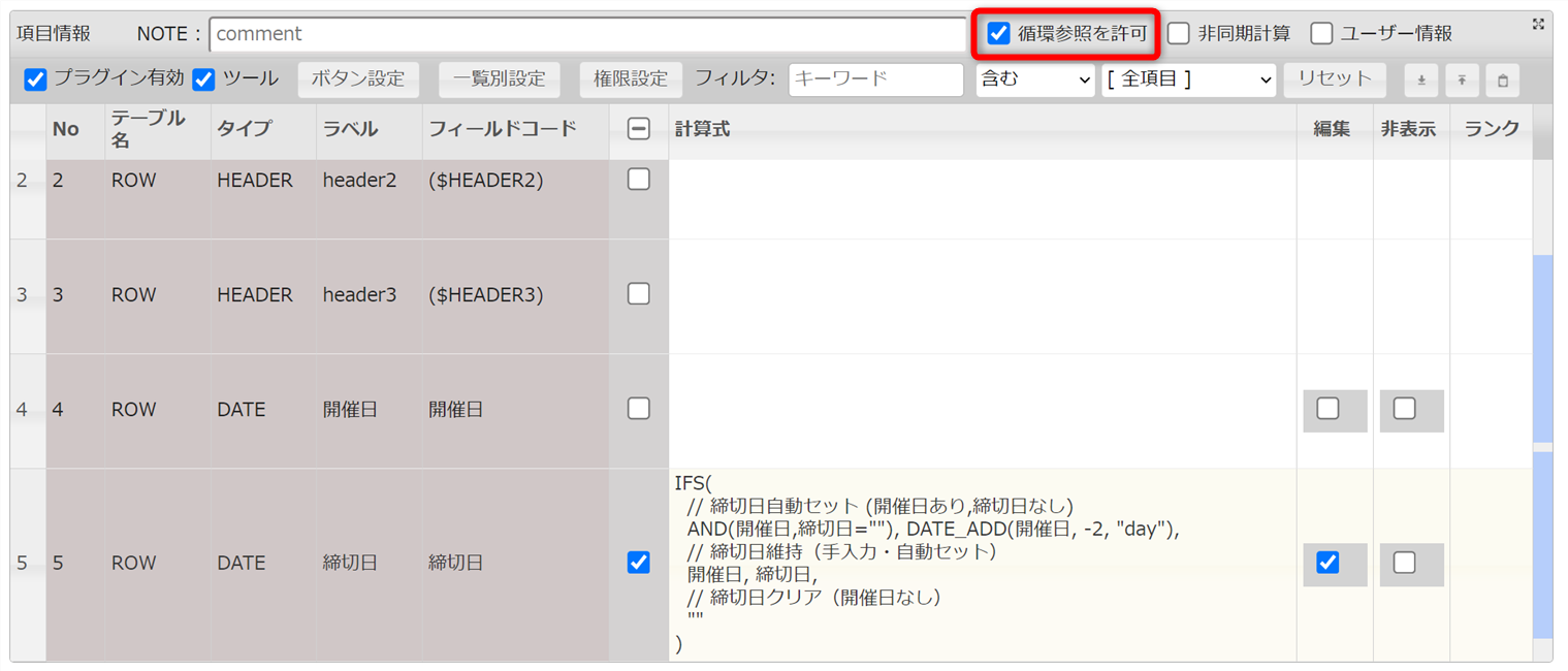 - 循環参照を許可を有効化することで、計算式内で自分自身の値(締切日)を参照可能