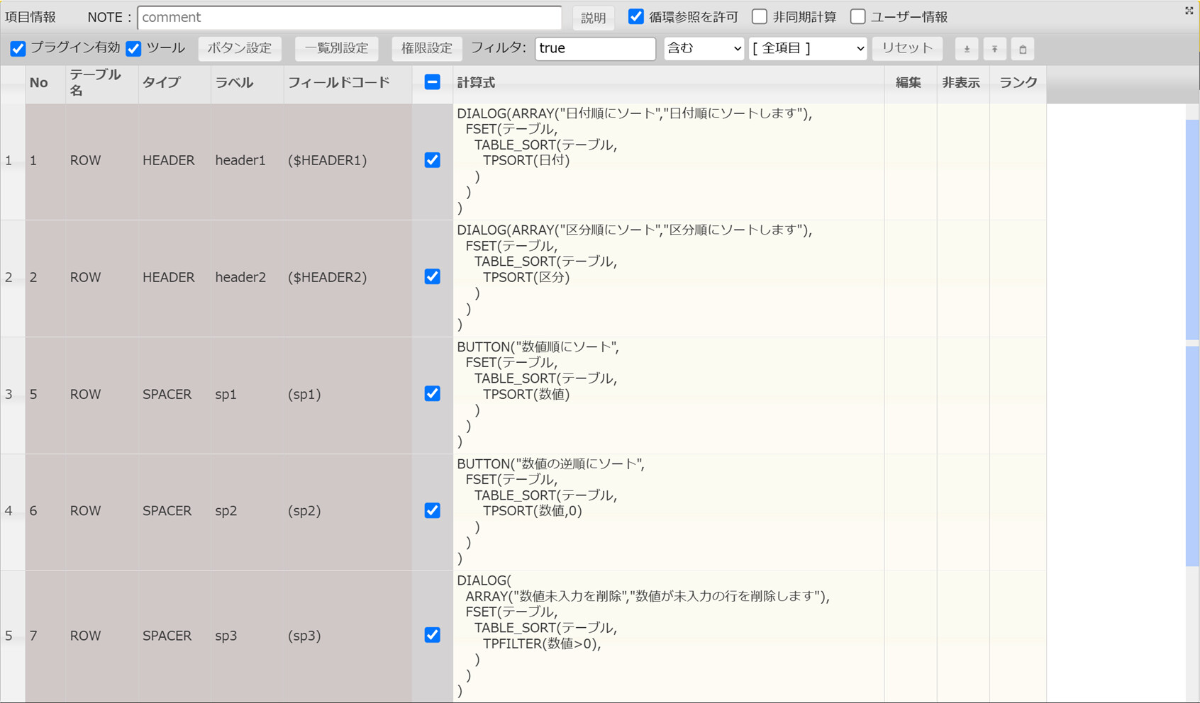 計算式プラグインの TABLE_SORT を使って、テーブルのソート/フィルターを行うことが出来ます。