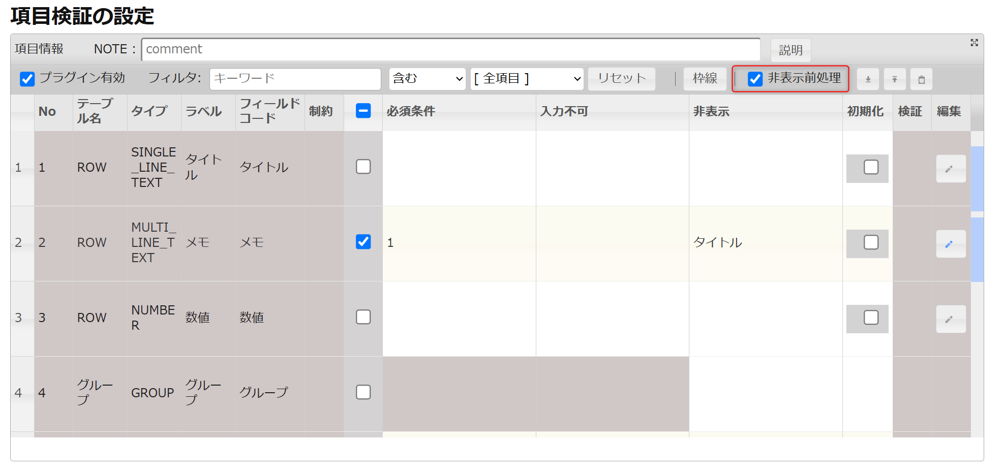 他プラグインで項目のDOM操作を行う場合は、「非表示前処理」が競合する場合があります。競合時は「非表示前処理」を無効にしてください。