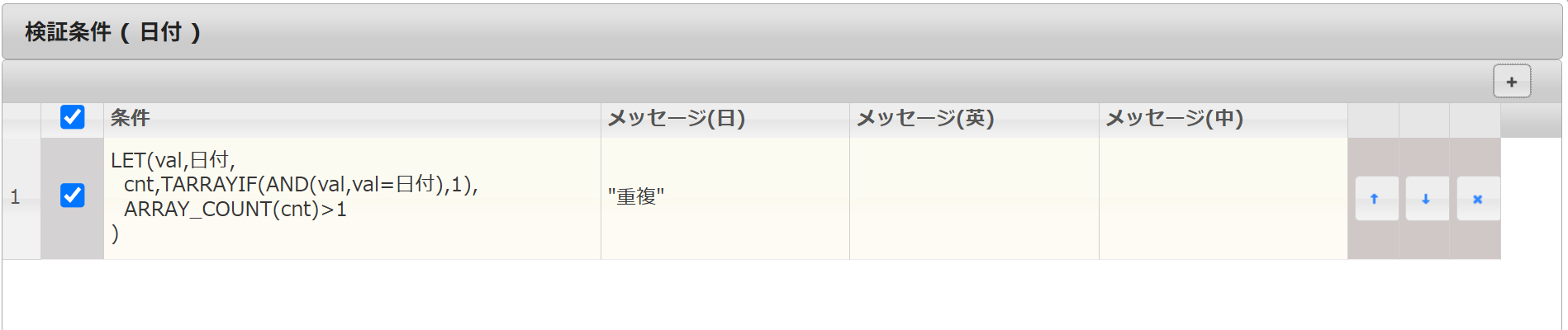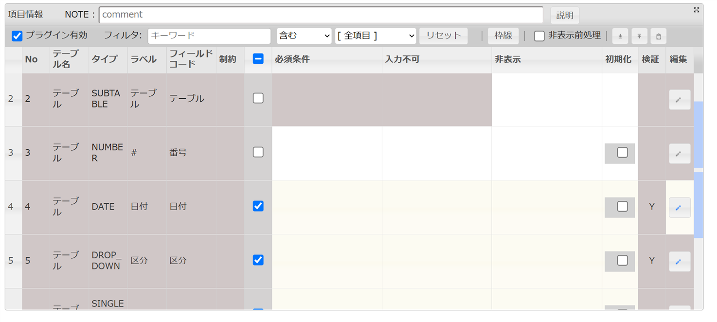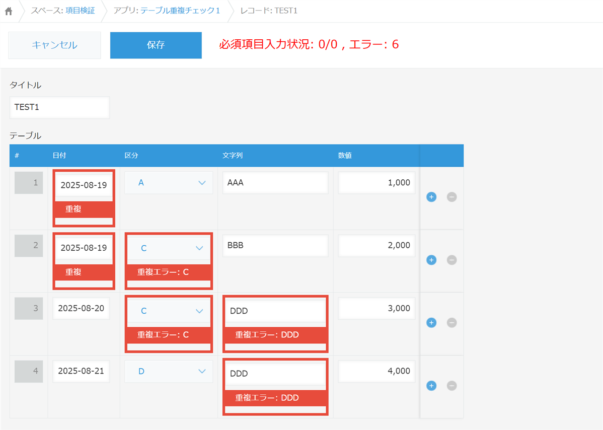項目検証プラグインで、テーブル内項目の重複チェックを行います。