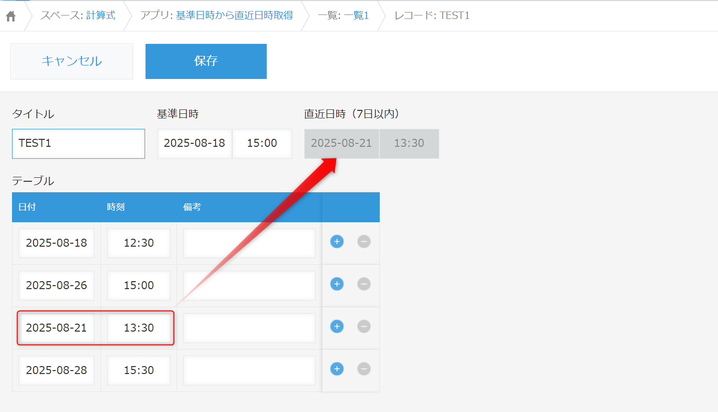計算式プラグインで、基準日時から7日以内のテーブル最小日時(直近日時)を求める例です。