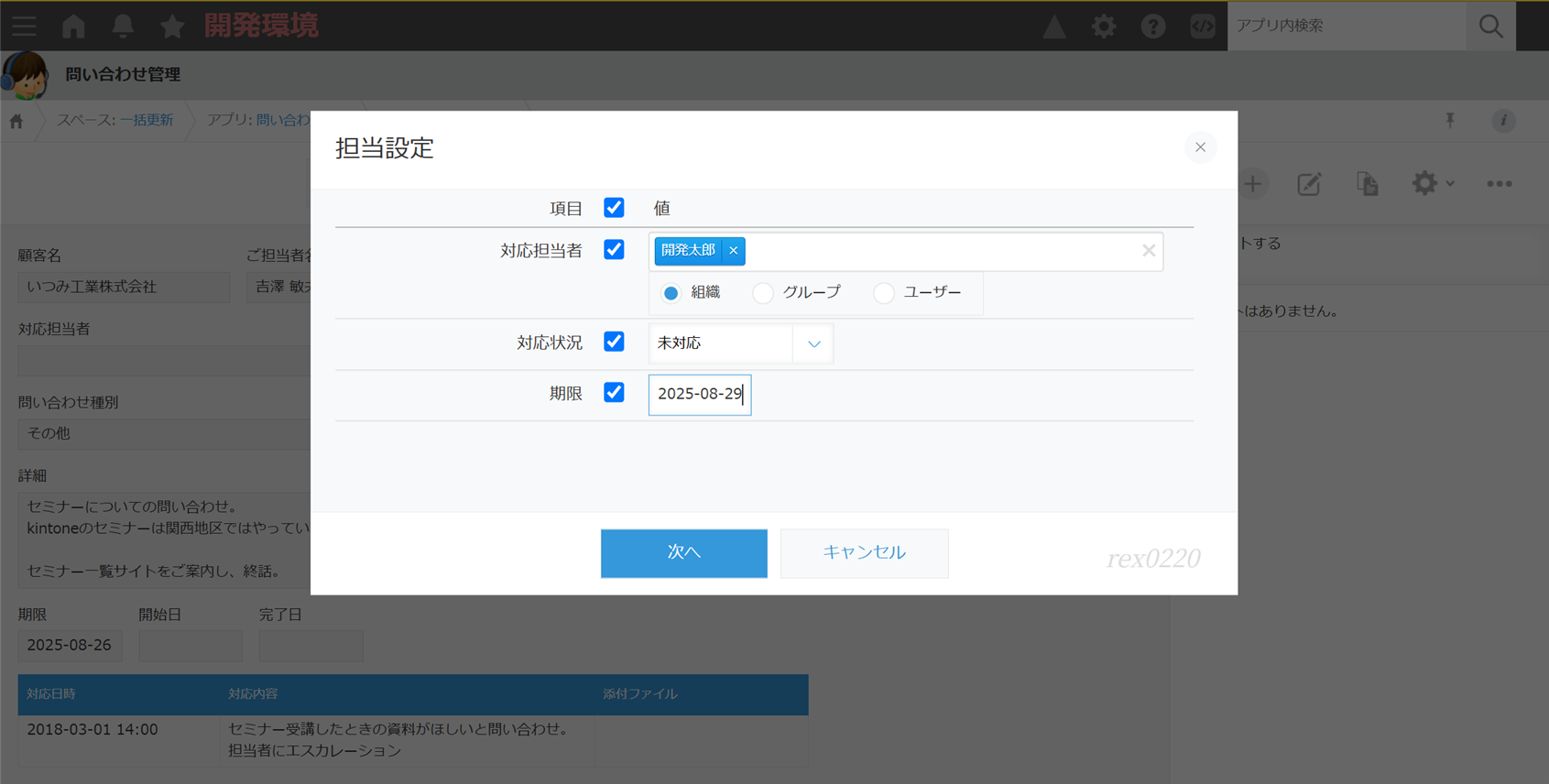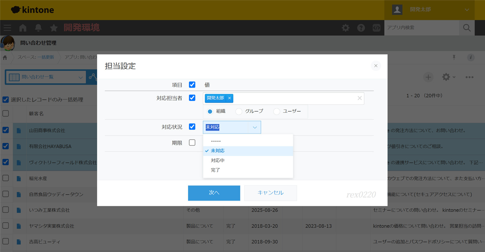 問合せ管理アプリを例に、対応担当者・対応状況・期限を一括セットするケースを紹介します。 ユーザー選択・日付・文字列など、業務に合わせて柔軟に組み合わせて設定できます。