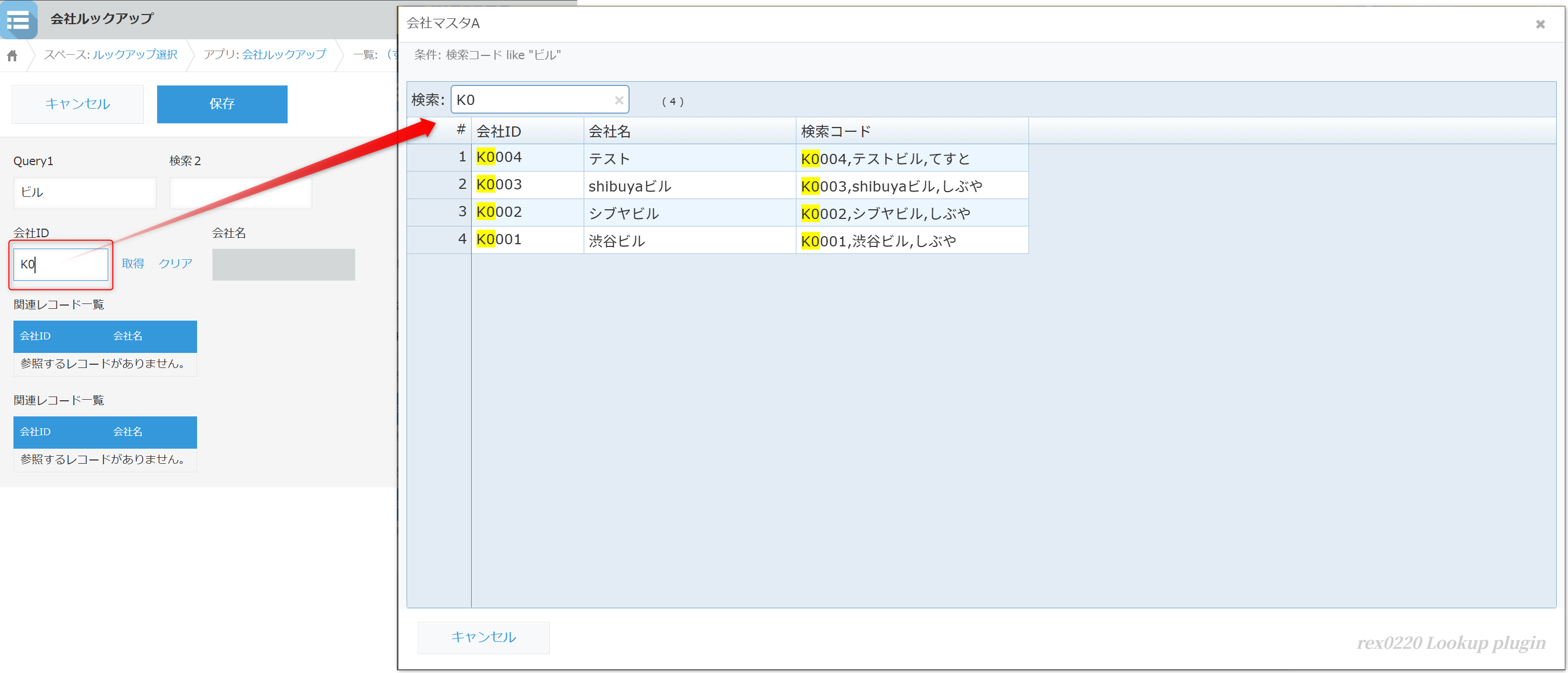 ※ Ver.38 ・ルックアップ項目に値を指定している場合の動作を変更 検索で対象レコードが 1 件の場合 → そのままルックアップ取得(※レコード取得処理のため、わずかにタイムラグが発生) 検索で対象レコードが 1 件以外の場合 → kintone 標準のエラー表示ではなく、プラグインのダイアログを表示し、指定値でフィルター処理を行うよう変更