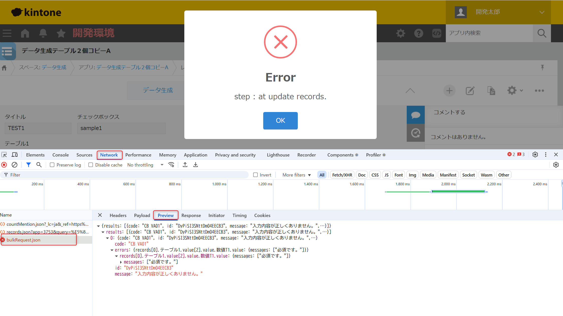 下記の例は、テーブル内項目の必須項目に値が未設定でエラーになったケースです。