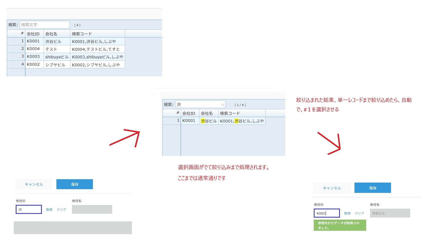 ここで「渋谷」や「shibuya」など(今回の場合「渋」や「s」でもいいのですが)単一レコードまで絞り込めるのであれば、選択画面も出さずに取得させることは出来ないでしょうか。