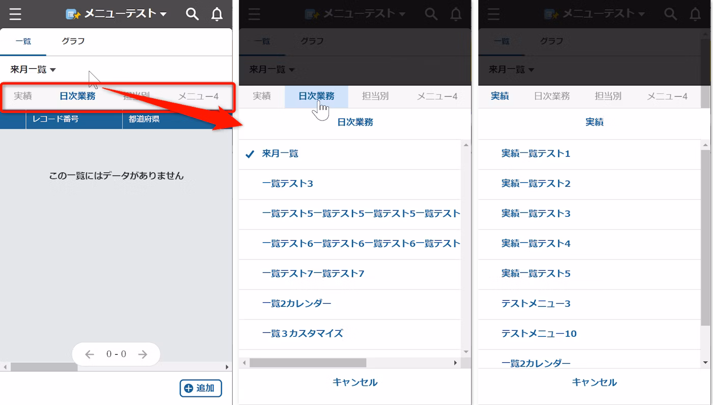 一覧ごとに ユーザー・組織・グループ単位で表示制御。