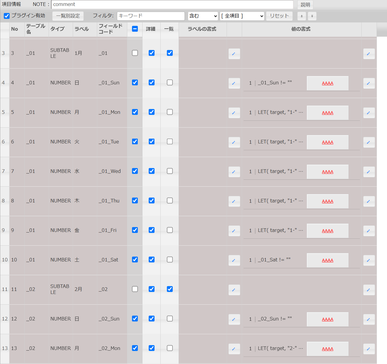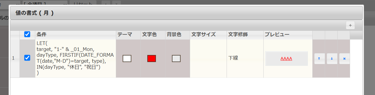 休日プラグイン・横並びプラグイン・項目書式プラグインを利用したカレンダー生成
