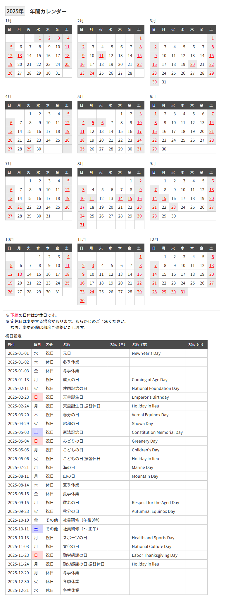 取引先に直接渡すため、弊社営業日を記載した簡易カレンダーを印刷(またはPDF配布)していましたが、毎年このカレンダーをExcelで作成するのが億劫になったため、横並びプラグインの応用例2が公開されたときに作成したものです。
