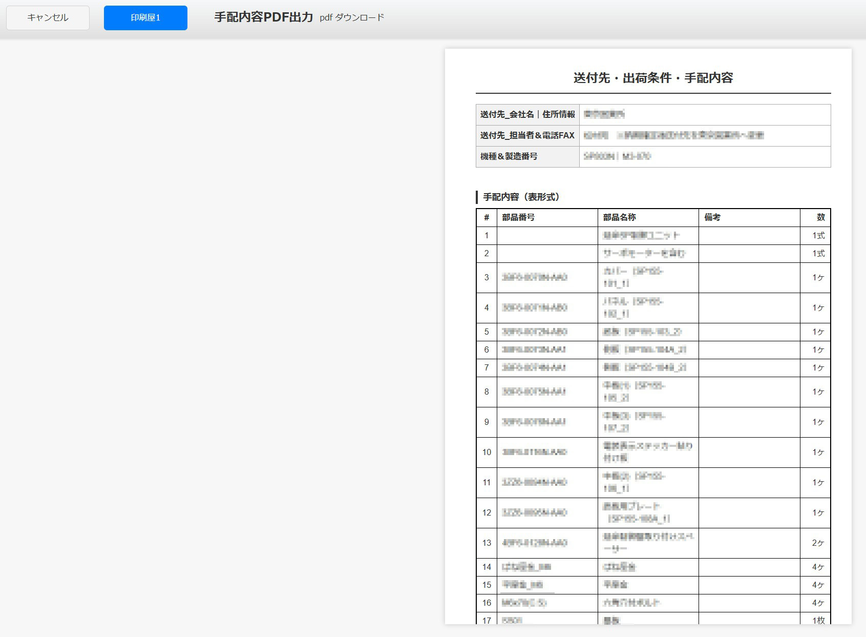 TPOUT(部品番号, 部品名称, 数量, 単位, 備考),
