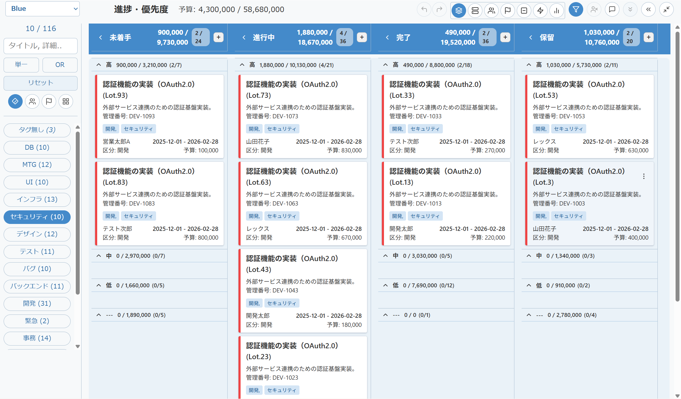・ 強力なフィルター機能: タグ・優先度・担当者などを使って、必要なカードだけを素早く絞り込み