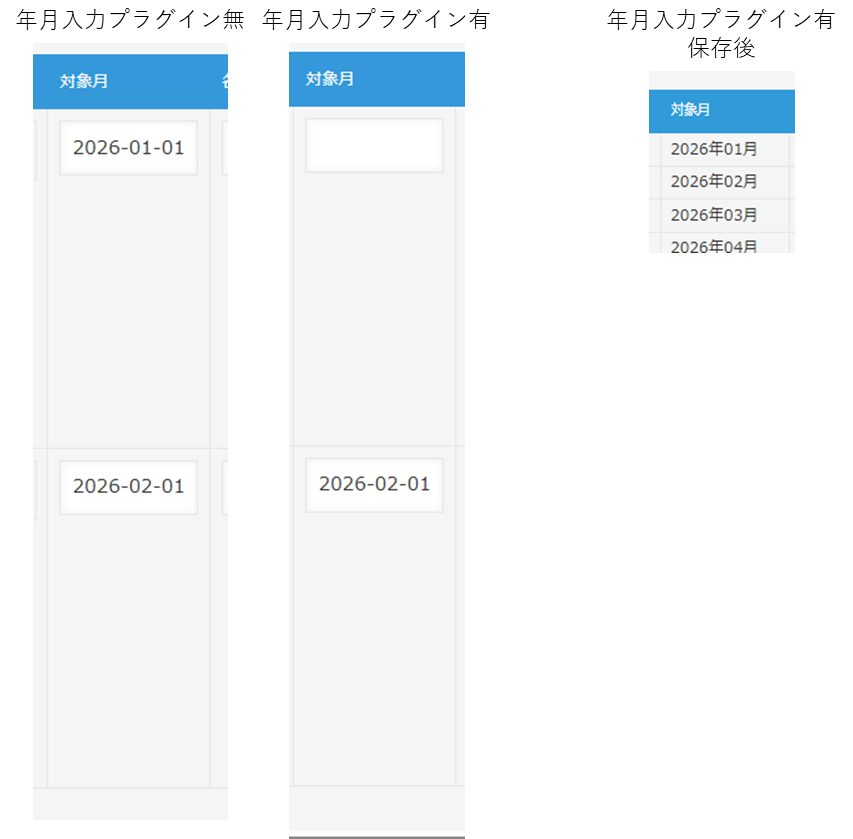 ・他JavaScript カスタマイズ、他プラグインがある場合は、年月入力プラグインと計算式プラグインのみを有効にして動作確認
