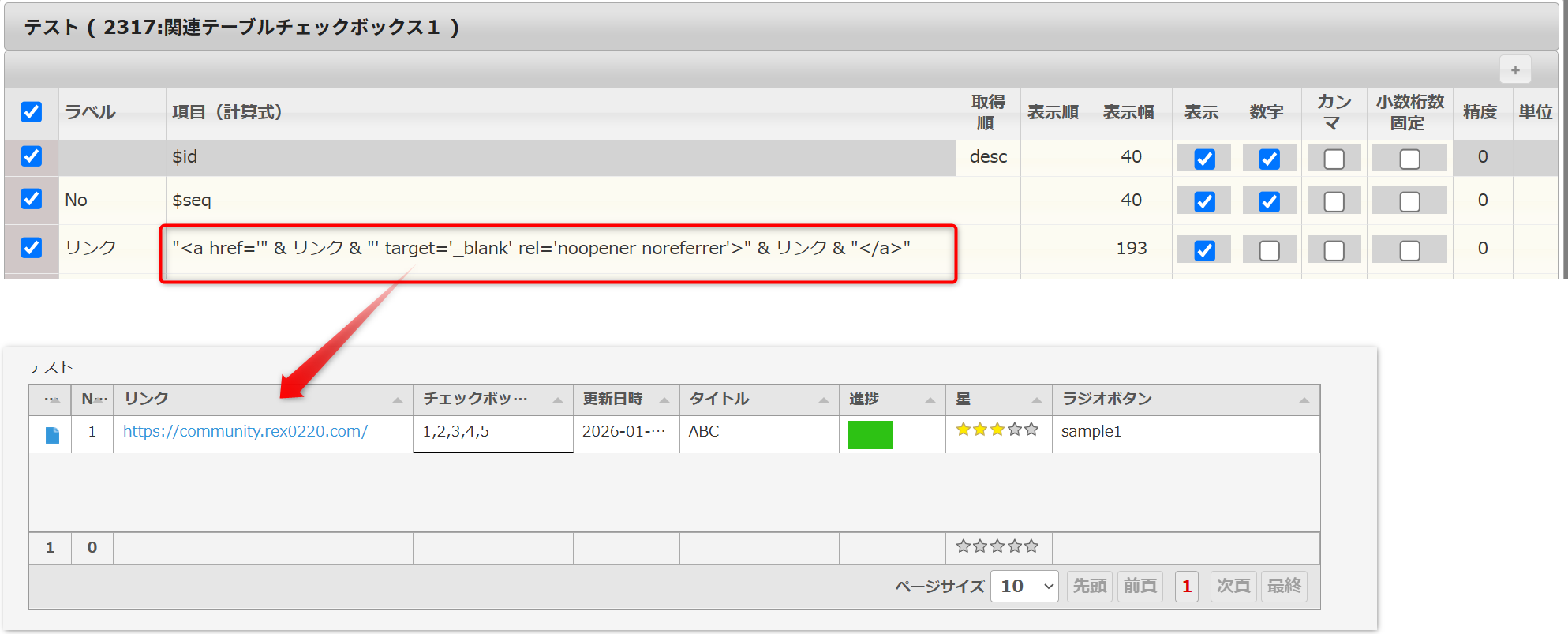 &):& を使って、固定の文字(HTMLタグ)とフィールドの値(リンク)をくっつけます。"<a href='" : リンクの開始タグです。target='_blank': リンクを新しいタブで開くための指定です。rel='noopener noreferrer': セキュリティとパフォーマンスのための標準的な記述です。">" : 開始タグの終わりです。"</a>" : リンクの終了タグです。/(スラッシュ)が含まれていますが、今回のように // と連続しない場合は、そのまま記述してもコメントアウトされませんので安心してください。https://community.rex0220.com/ がある場合の例問題と解答の形式でまとめます。
