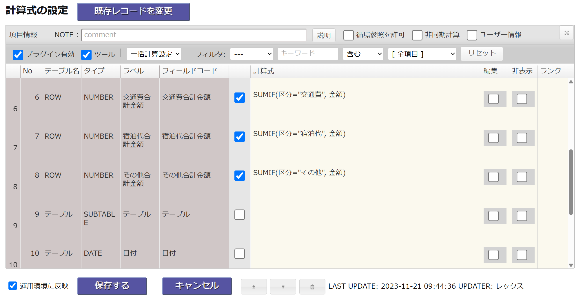 ※ Ver.96 変更点 ・プラグイン設定画面のグリッドライブラリバージョンアップ ・プラグイン設定画面の一括計算設定ボタン変更 ・プラグイン設定画面のフィルター機能変更 ・プラグイン設定画面でスピナー表示追加 ・プラグイン設定のダウンロード&アップロード、クリップボードボタンの位置を変更 ・プラグイン設定情報保存時のエラー対応