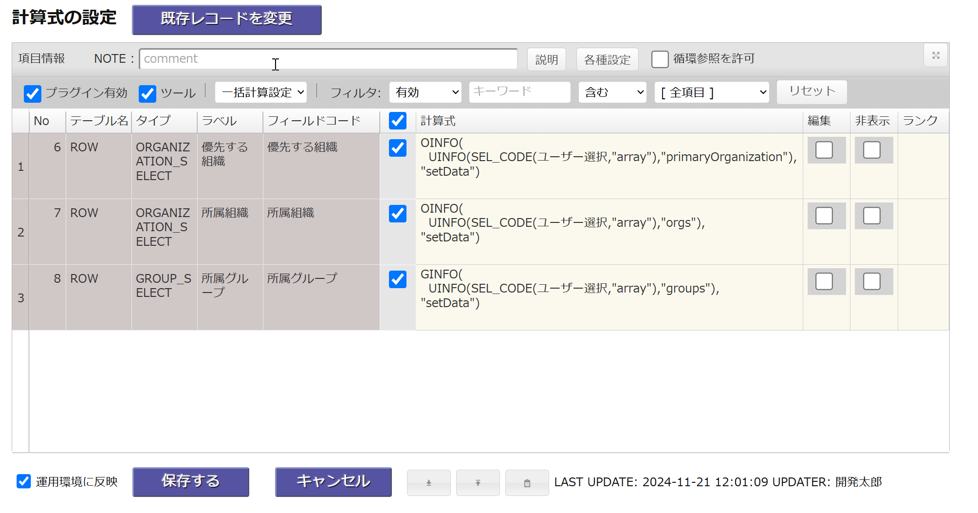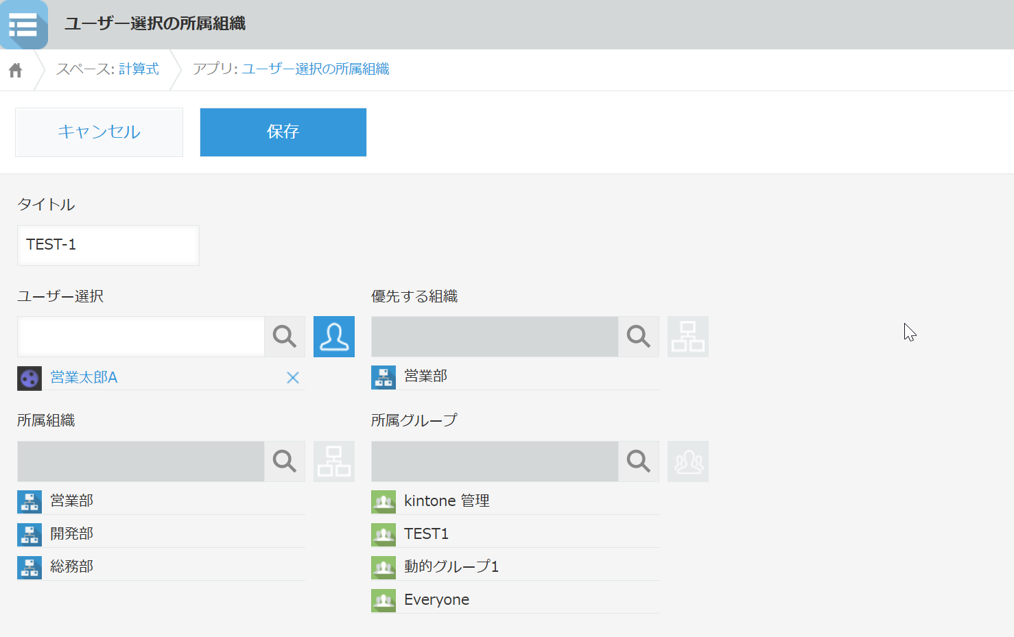 計算式プラグインで、ユーザー選択の所属組織やグループを取得・セットすることが出来ます。