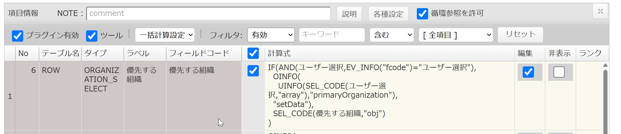 計算式プラグインで、ユーザー選択のから組織を自動セットして、その後組織を編集できるように設定してみます。