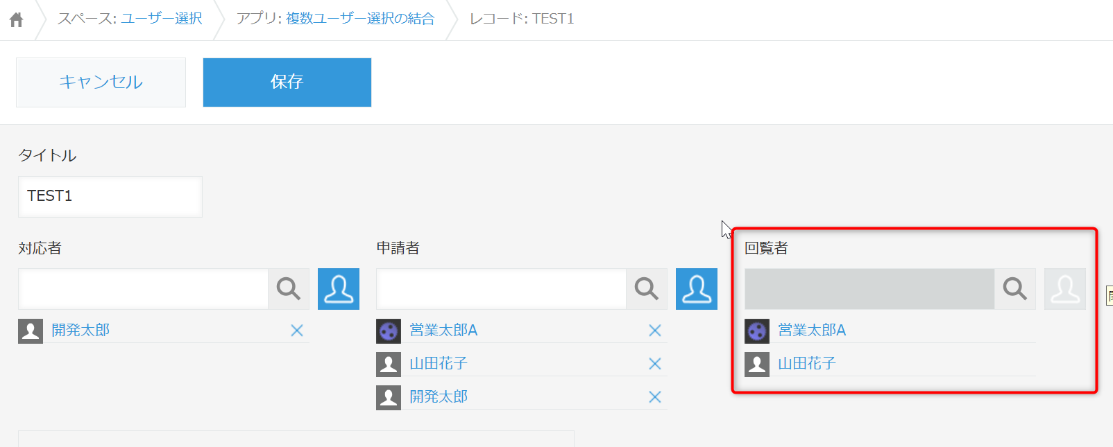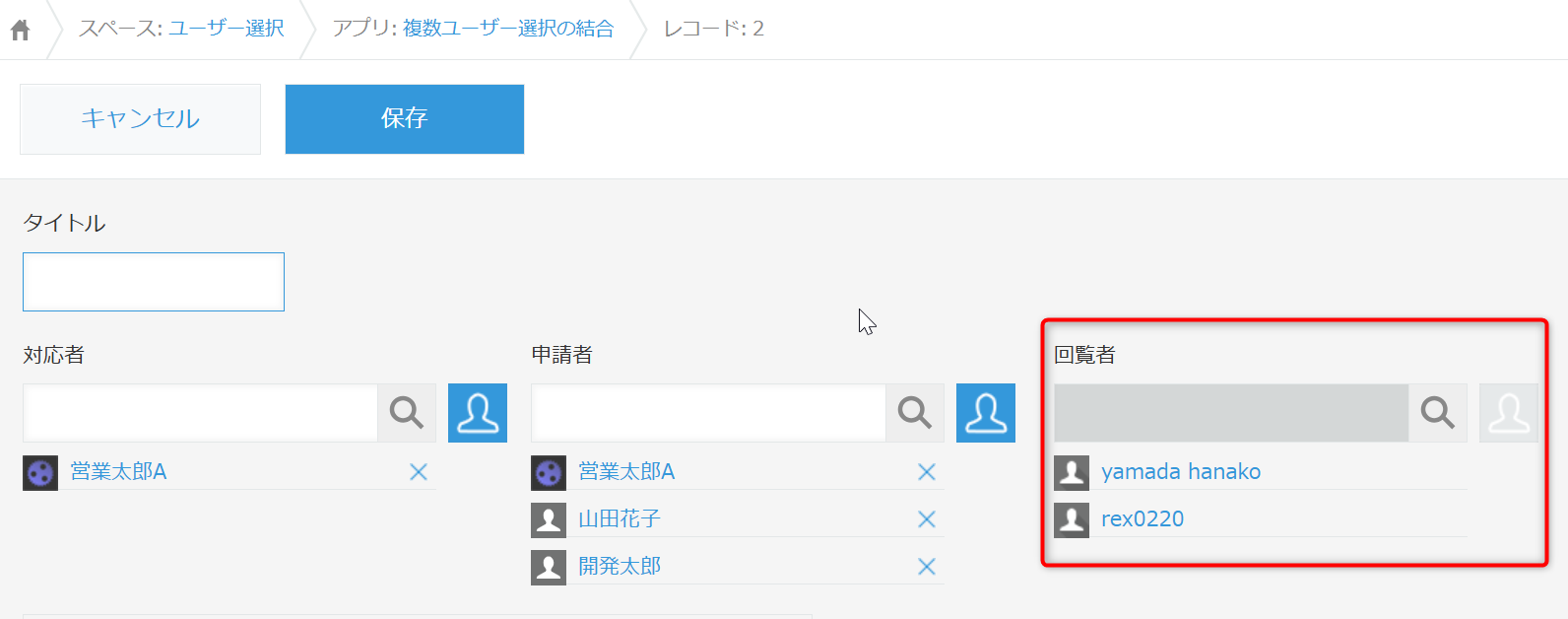 - 役割: 「対応者」フィールド(ユーザー選択)に選択されているユーザーのユーザーコードを、配列(リスト)形式で取得します。